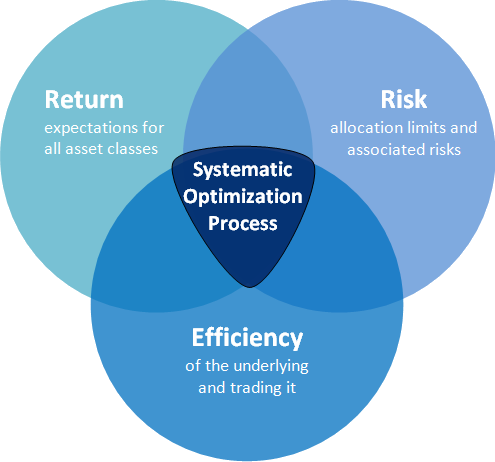 Through systematic investment processes and an in-depth analysis on each asset class, the use of models aims to maximize the risk-adjusted expected return. The objective is to create an asset allocation that produces the maximum possible return while respecting your particular risk tolerance. Translating investor outcomes and restrictions into globally well-diversified allocations: Return – Risk – Cost.